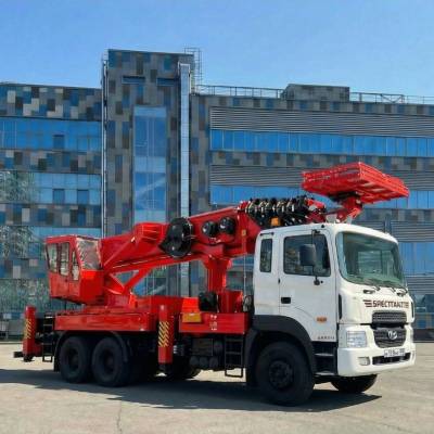 Автовышка позволяет выполнять работы на высоте до 55 метров с грузоподъемность 300 кг. Оснащена полноповоротной люлькой с функцией управления установкой как из машины, так и с выносного пульта. Данная установка - промышленный, очень маневренный подъемный механизм, предназначенный для выполнения широкого спектра работ. Преимущество её в том, что четырех-секционная телескопическая стрела позволяет точно и аккуратно производить работы по краям зданий и сооружений.